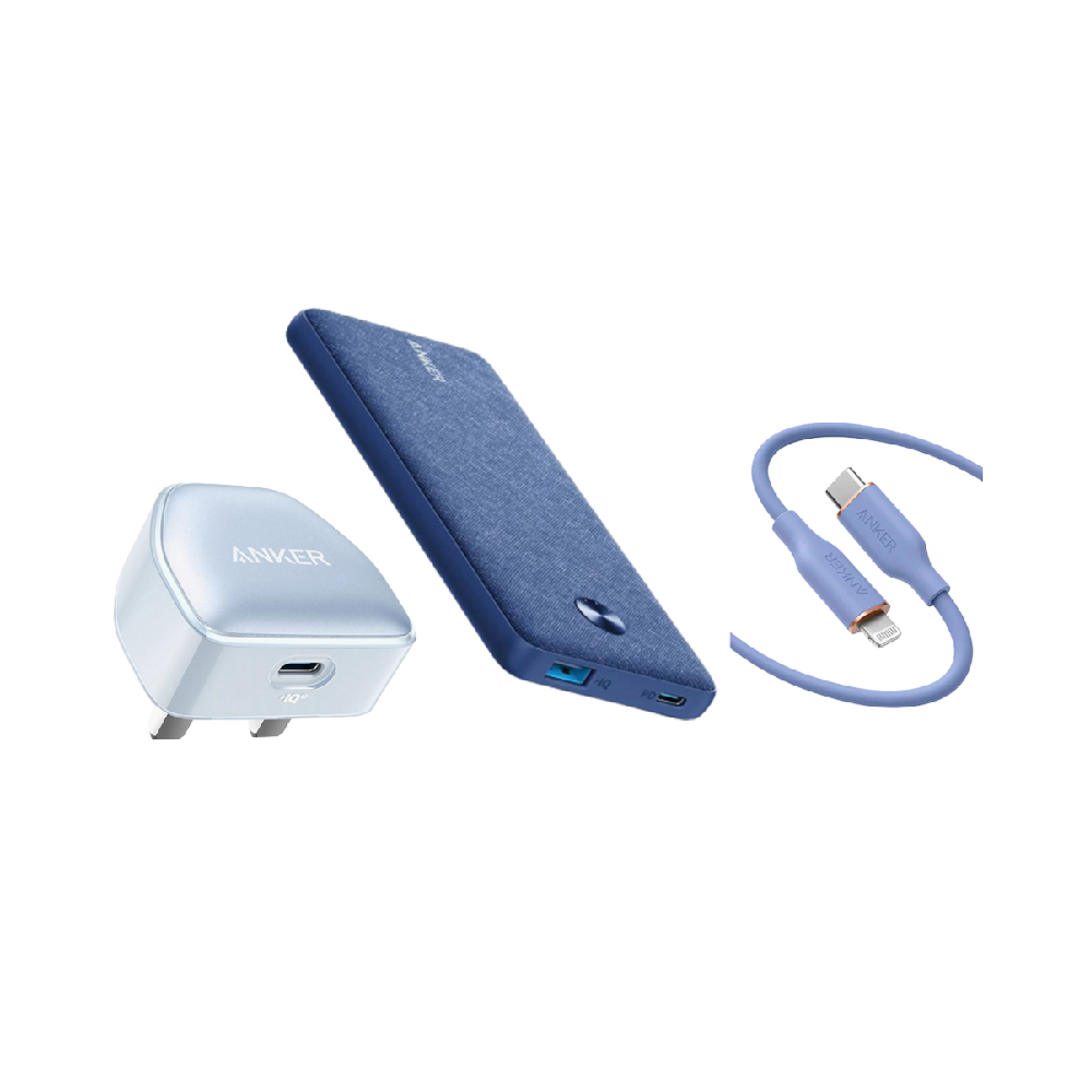 The Anker 3-in-1 iPhone Starter Kit includes a Power Bank, fast charger, and USB-C to Lightning cable, providing an all-in-one charging solution.