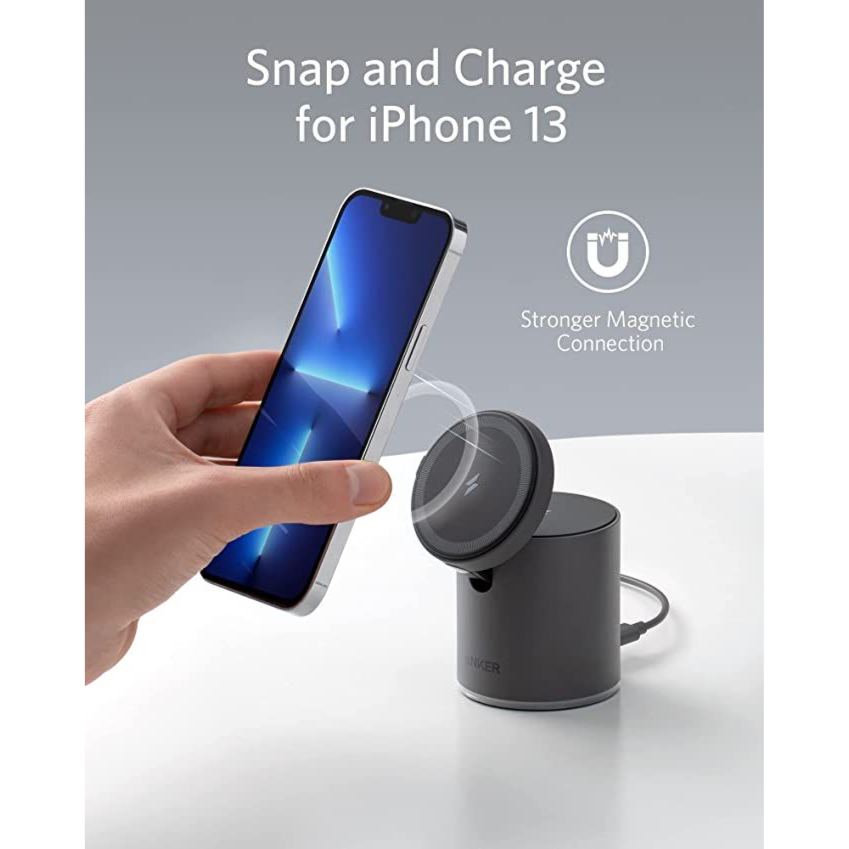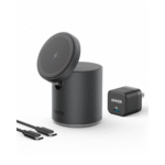 The Anker 623 Maggo 2-in-1 is an innovative magnetic wireless charging solution featuring a cylindrical base with an adjustable charging pad. This versatile charger combines style with functionality, offering both wireless charging capabilities and an elegant design that complements any space.
