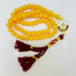 This elegant prayer beads (tasbeeh) features vibrant yellow beads adorned with the official State of Qatar emblem medallion in gold tone. The tasbeeh is beautifully accented with maroon tassels and gold-colored decorative elements, reflecting Qatar’s national colors.