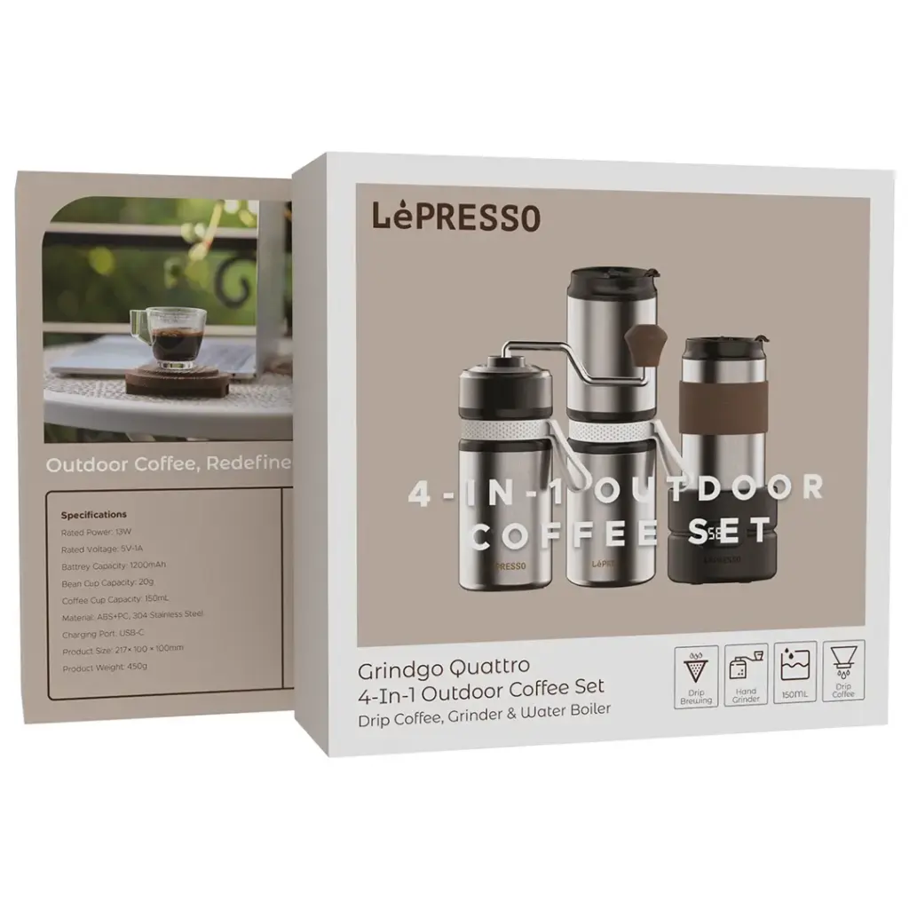 طقم القهوة الخارجي 4 في 1 جريندو كواترو من ليبريسو هو الرفيق المثالي لعشاق القهوة الذين يرغبون في تحضير قهوتهم في أي مكان يجمع هذا الطقم بين أربع أدوات أساسية وهي مطحنة القهوة، وأداة التقطير، وكوب حراري، وكوب تخزين محكم في تصميم مدمج ومحمول مصنوع من الفولاذ المقاوم للصدأ ومصمم لتوفير الراحة، مما يتيح لك طحن وتحضير القهوة الطازجة في أي وقت سواء أثناء التخييم أو السفر أو العمل